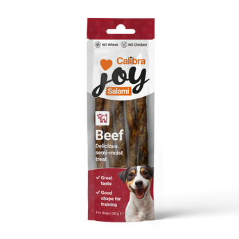 Calibra Joy Beef Salami Treats are tasty semi-moist sticks made with 70% real beef and contain no chicken or wheat. Complementary food for dogs.