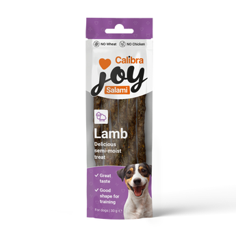 Calibra Joy Lamb Salami Treats are tasty semi-moist sticks made with 70% real lamb and contain no chicken or wheat. Complementary food for dogs.